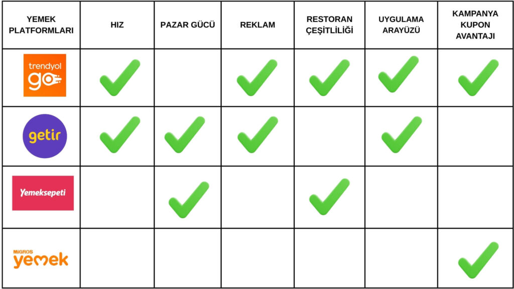 Şimdi yemek platformlarını kendi içlerinde özellikleri, avantajları ve dezavantajlarıyla birlikte karşılaştıralım.